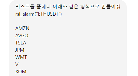 내가 선호하는 종목을 추가하는 방법은 하단에 rsi_alarm("종목티커") 를 추가하시면 됩니다.