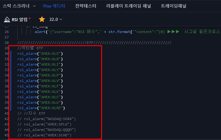 해당 스크립트는 내가 선호하는 종목을 추가하면, RSI 3단계 신호 포착 시 알림을 발생시킬 수 있습니다.